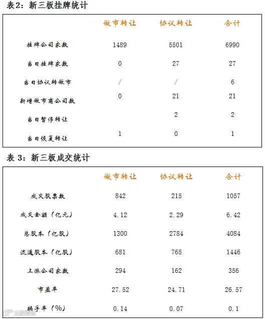 做市企业中有829只个股参与交易,成交额4.12亿元。其中294只个股上涨,432只个股下跌;5家做市企业成交额破千万,成交额前三名为联讯证券5498万、明利股份4224万、卫东环保2432万。