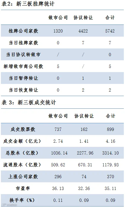 做市企业中有737只个股参与交易,成交额2.74亿元。其中296只个股上涨;3家做市企业成交额破千万:明利股份3306万、联讯证券2265万、卫东环保1623万。