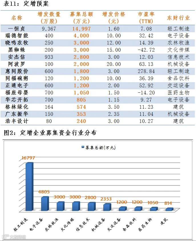 点评:3月10日,共有14家公司公布定增预案,总增发股数14364股,共募集资金3.70亿元。募集资金超过1亿元的有1家,募集资金最大为一恒贞,募集资金1.49亿元,总体来看,募集金额流向轻工制造行业较多。