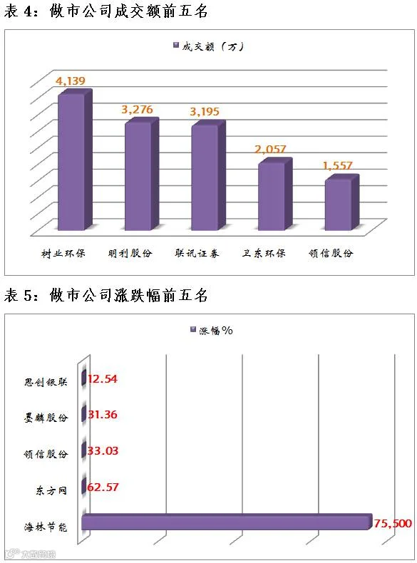 海林节能、东方网、领信股份涨幅居前,分别为7500%、62.57%和33.03%。相比之下,恒源食品、沃田农业、树业环保跌幅居前,分别为33.78%、13.59%和11.89%。