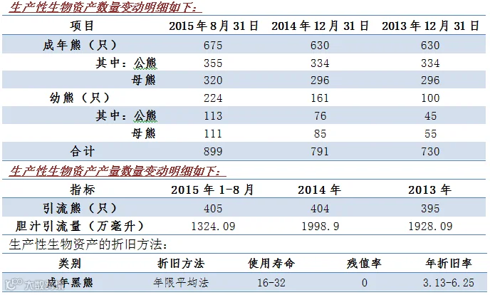 生产性生物资产使用寿命、预计净残值的确定依据生物学人工养殖黑熊寿命约35-40年,未满三岁的幼熊尚不符合抽取胆汁的要求,因此,公司根据谨慎性原则,将成年黑熊的最长使用寿命定为32年,预计净残值定为原价的0%。