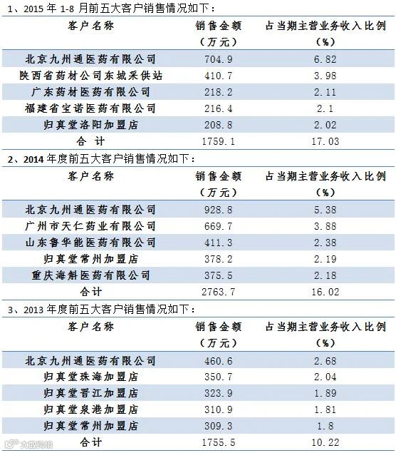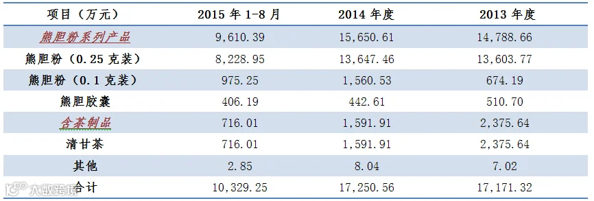 在报告期内(2013年、2014年、2015年1-8月),公司核心产品熊胆粉系列中药收入合计分别为1.47亿元、1.56亿元、9610万元,占营业收入比重分别为86.12%、90.73%、93.04%,毛利率分别达到87.34%、88.99%、89.36%,扣除非经常性损益后的净利润分别达到了5911万元、5770万元、3023万元,实现了稳定、高额的股东回报。