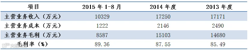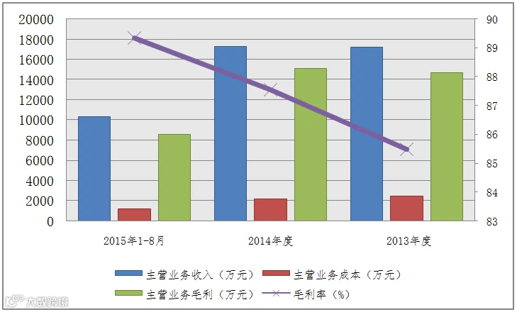 公司2015年1-8月、2014年度和2013年度主营业务收入综合毛利率分别为88.16%、87.55%和85.49%,报告期内有小幅提高,公司各主要产品毛利率变动情况如下: