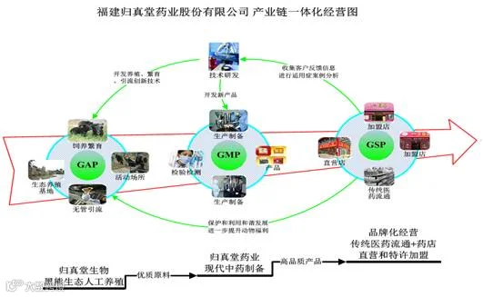 形成了以上游GAP(黑熊生态养殖)、中游GMP(现代名贵中药制剂)、下游GSP(中医药品牌化经营)的产业链一体化经营模式,以“研发为核心,覆盖生态养殖、天然药物生产、品牌化经营”的竞争策略,从而逐步实现从核心名贵稀缺中药资源培育、标准化的质量管控、全产业链深耕细作,为客户通过医院、药店、中医馆等多种终端网点提供优质的名贵中药材和健康服务,为公司创造良好的品牌形象,从而实现公司长期、稳定的利润回报。