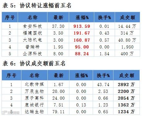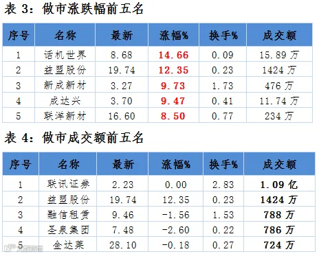 涨跌幅方面,话机世界、益盟股份和新成新材涨幅居前,分别为14.66%、12.35%和9.73%。相比之下,赛亿智能、众益传媒和北方园林则跌幅居前分别为23.85%、18.90%和16.00%。