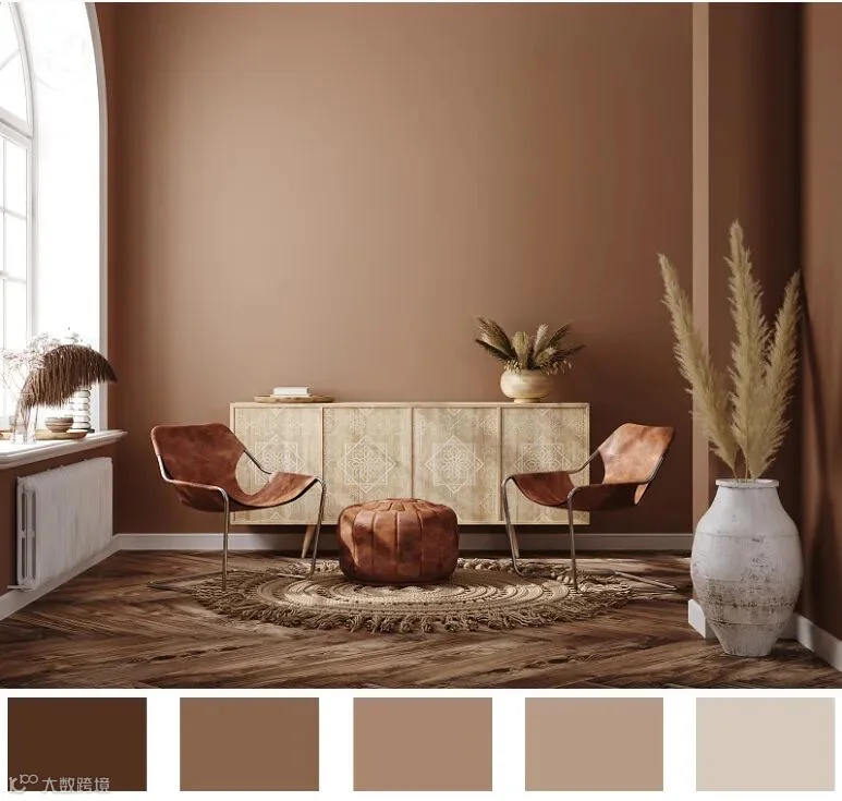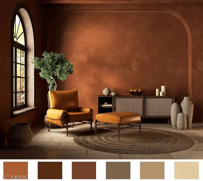 美拉德风格的主色调是棕色系,这种色系给人一种沉稳厚重的感觉,营造出整个环境的宁静和舒适。它给人带来温暖治愈的安全感和归属感。要打造美拉德风格,可以选择纳美新材的建筑涂料来创造各种肌理效果,同时软装配饰要低调却又充满质感,布艺品可以选择天鹅绒、灯芯绒等稍厚实的材质。室内灯光最好调至暖色。利用不同浓度的棕褐色调,可以创造出新的配色设计灵感,为空间营造温暖仿古的独特氛围,让家居温润如玉,回归生活的本质。