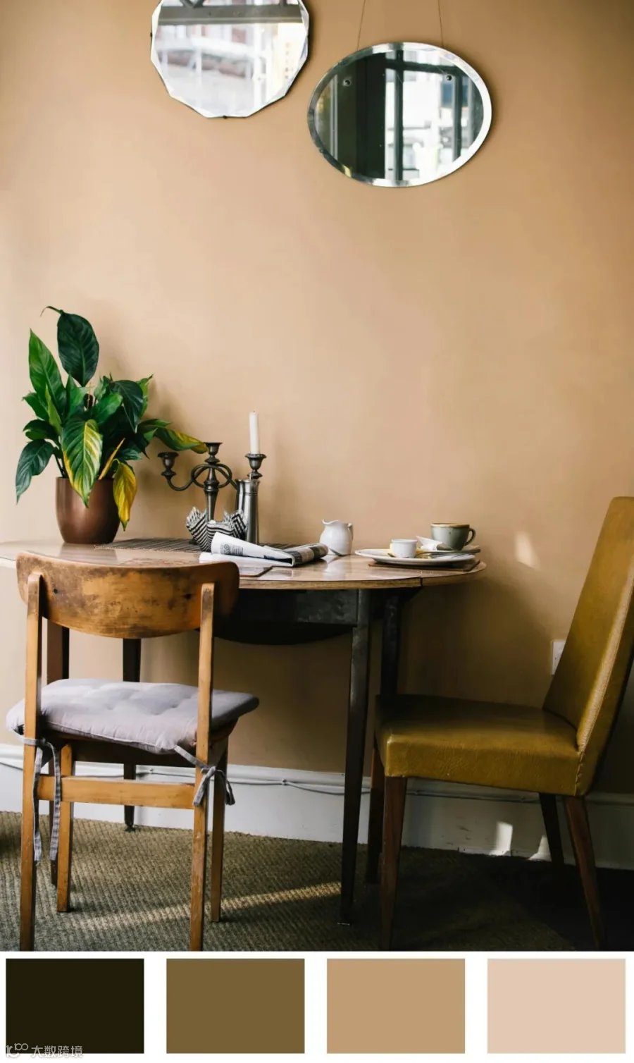 如果你的家整体色调偏暗,也可以考虑深色的美拉德风格。你可以选择质感丰富的奶咖色玛曼驽墙面,搭配复古的木色柜子和简单的桌椅。复古的木色家具营造的氛围,可以让家居看起来更加层次丰富、高级,同时也打造出舒适温暖的家居环境。