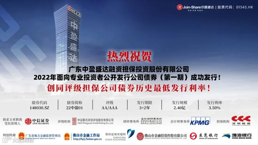 8月22日,广东中盈盛达融资担保投资股份有限公司2022年面向专业投资者公开发行公司债券(第一期)(简称“22中盈盛达01”)成功发行。本期债券发行规模2.4亿元,期限3+2年期,主体评级为AA,债项评级为AAA,票面利率仅3.50%,创同评级担保公司债券历史最低发行利率!此次全场认购倍数高达2.92倍,边际认购倍数达到1.58倍。投资者表现踊跃,体现出业界对公司发展的充分肯定和高度认可。