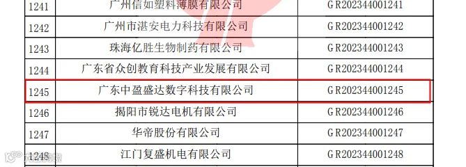 近日,全国高新技术企业认定管理工作领导小组办公室陆续公布了2023年“高新技术企业”名单,广东中盈盛达数字科技有限公司(以下简称“数科公司”)凭借在多项核心知识产权、科技成果转化技术、组织研发管理水平及综合发展潜力方面的突出成绩,首次成功认定为2023年“国家高新技术企业”。