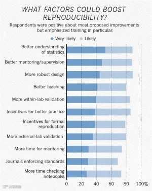 超过60%的受访者表示,发表论文的压力和有目的的选择性报告结果是导致可重复性问题的原因。半数以上的受访者认为是实验室重复不足、监督不力或统计能力不足造成的。还有一小部分人指出了试剂的变异或使用难以重复的专门技术等阻碍了结果的重现性。