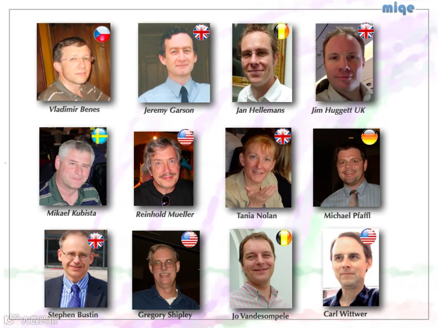 第三行第1位,Stephen A Bustin,MIQE 指南的第一作者,MIQE 最主要的推动者和践行者;第三行第3位,Jo Vandesompele,著名的 qPCR 数据分析专家,提出了许多原创性的数据分析理论和方法;3、第三行第4位,Carl T. Wittwer,著名的犹他大学教授,前 Biofire 的联合创始人(2013被生物梅里埃收购,产品品牌为 FilmArray),是荧光定量 PCR 的技术先驱,率先将 SYBR Green I 和熔解曲线引入 PCR,发明了高分辨率熔解曲线分析;也是学术界大牛,他的多数学术成果,都转化成了具体产品。