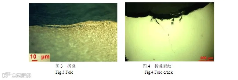 (2)轧制过程可能引起的缺陷:残余缩管及中心裂纹;折叠缺陷(如图3);线状缺陷、划痕;表面锈蚀坑;过烧、桔皮状表面、麻坑;这些都可能导致弹簧失效。所以钢厂应尽量避免和消除轧制过程中产生的缺陷,弹簧厂应加强对弹簧原材料质量检查,尽量采用表面质量好的材料。