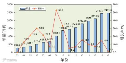 图2 我国2003~2017年乘用车销量及增长率