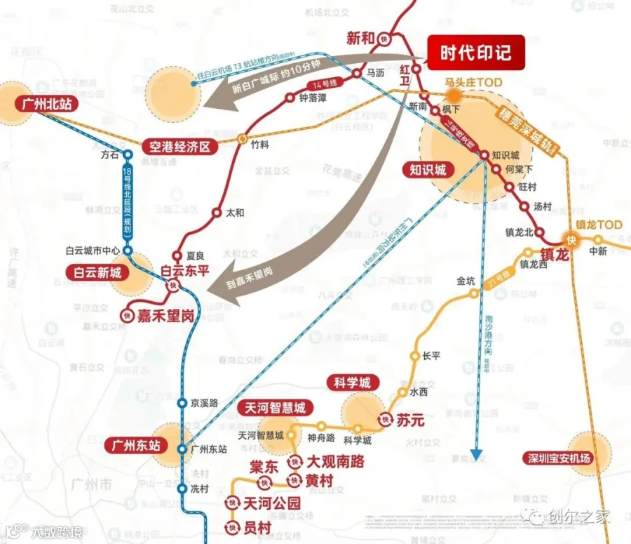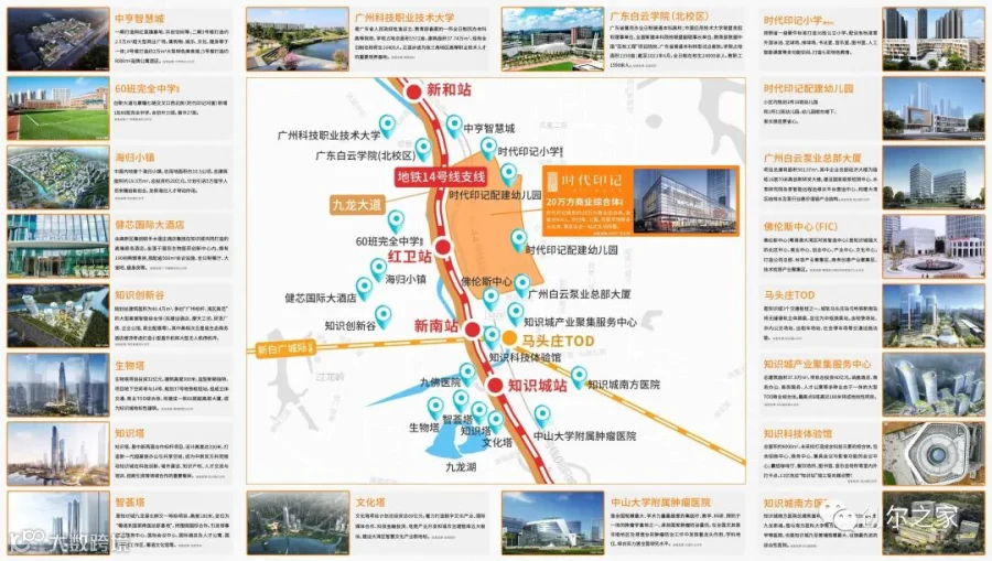1地铁:地铁14号线支线,贯穿整个知识城,北连白云14号线【新和站】,南接21号线【镇龙站】TOD。