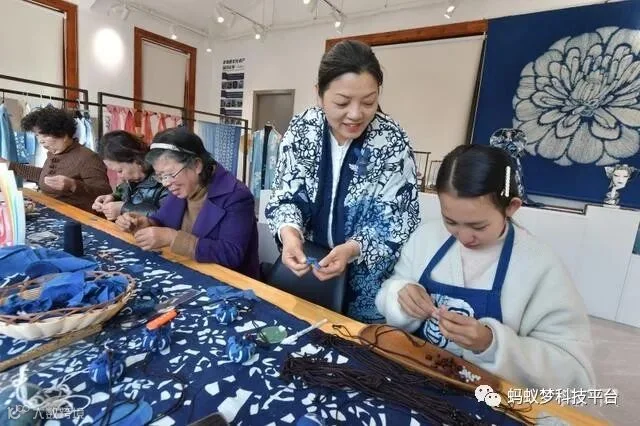 喜曼蓝富工坊致力于建设蓝印花布传承与产业体系,创新开发蓝印花布文创产品、来料加工、非遗研学课堂、视频直播带货四大主体业务,逐步构建起蓝印花布产、学、研、游、销一体化共富产业链。