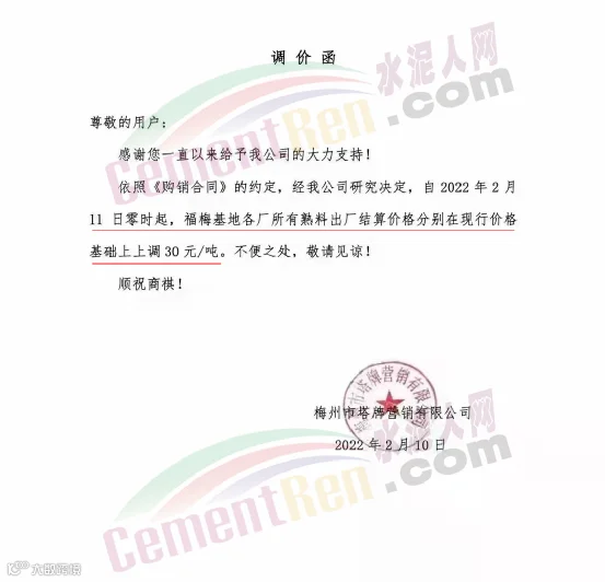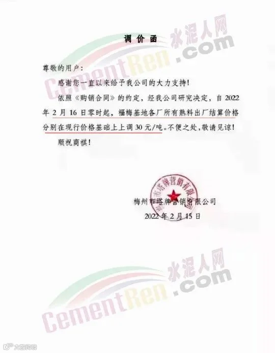 广东梅州塔牌水泥通知自2022年2月16日零时起,福梅基地各厂所有熟料出厂结算价格分别在现行价格基础上上调30元/吨。节后两次调涨累计涨60元/吨。
