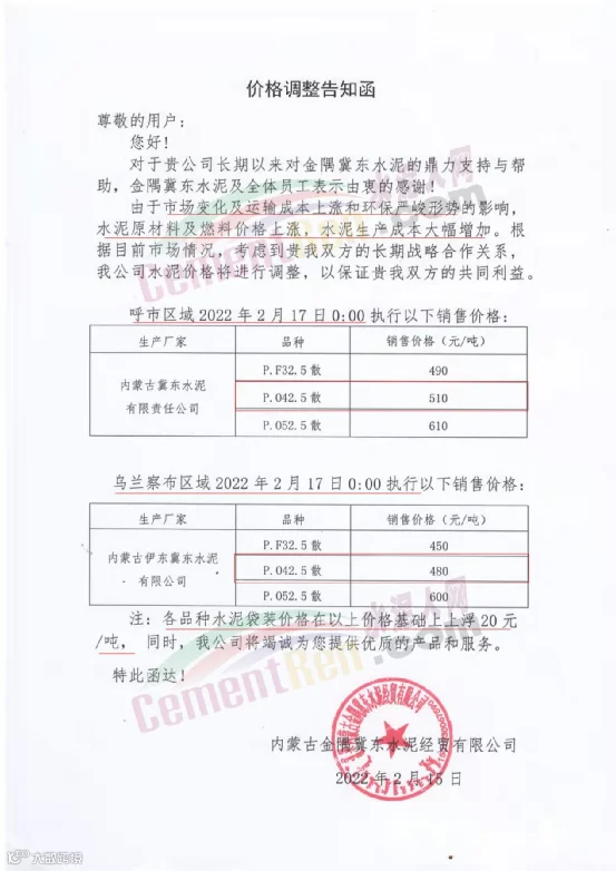 呼市区域自2月17日0时起执行P.F32.5散490元/吨,P.O42.5散510元/吨,P.O52.5散610元/吨;