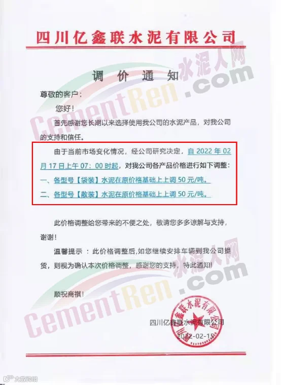 四川亿鑫联水泥有限公司通知,由于当前市场变化情况,经公司研究决定,自2022年2月17日上午7时起,对公司各产品价格进行调整。各型号水泥在原价格基础上上调50元/吨。