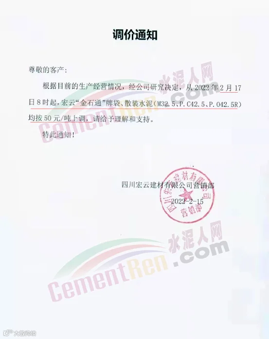四川宏云建材有限公司营销部通知,根据目前的生产经营情况,经公司研究决定,从2022年2月17日8时起,宏云“金石通”牌袋、散装水泥(M32.5、P.C42.5、P.O42.5R)均按50元/吨上调。