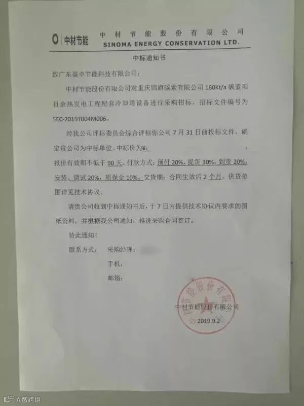热烈祝贺我司在“重庆锦旗碳素有限公司160Kt/a碳素项目余热发电工程配套冷却塔设备进行采购招标”成功中标“砼柱方形横流节能冷却塔”设备。为我司在全国布局再树新篇章。