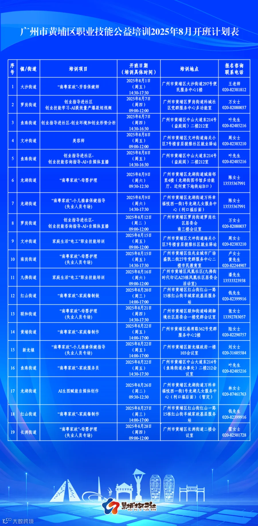 ▲上下滑动,查看黄埔区职业技能公益培训2025年8月开班计划表,培训安排最终以实际开展为准
