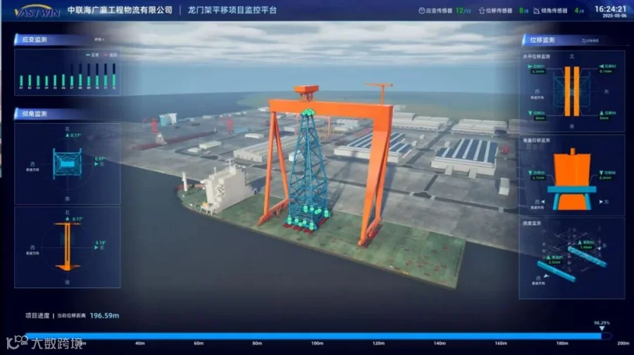 在龙门吊整体移运过程中实时监测塔架应力、塔架与主梁接触位移、龙门吊倾角、风速等数据。所有监测数据实时传输至指挥中心,超出阈值及时预警,现场根据预警信息及时调整处置,以数智化科技手段确保龙门吊整体出运的本质安全。