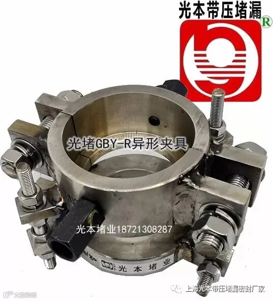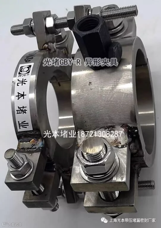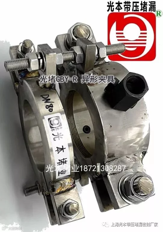 本品为阀门容器上短接等特殊部位带压堵漏抢险包运专用级产品,本品在堵业内类别为堵漏夹具或者堵漏卡具类,中国堵业主要是做管网容器阀门带压堵漏抢险包运的,本行业需要专业堵漏工操作使用,常见的管道夹具和法兰夹具是夹具类最简单的夹具,便于加工制作,每个堵漏工都可以加工。