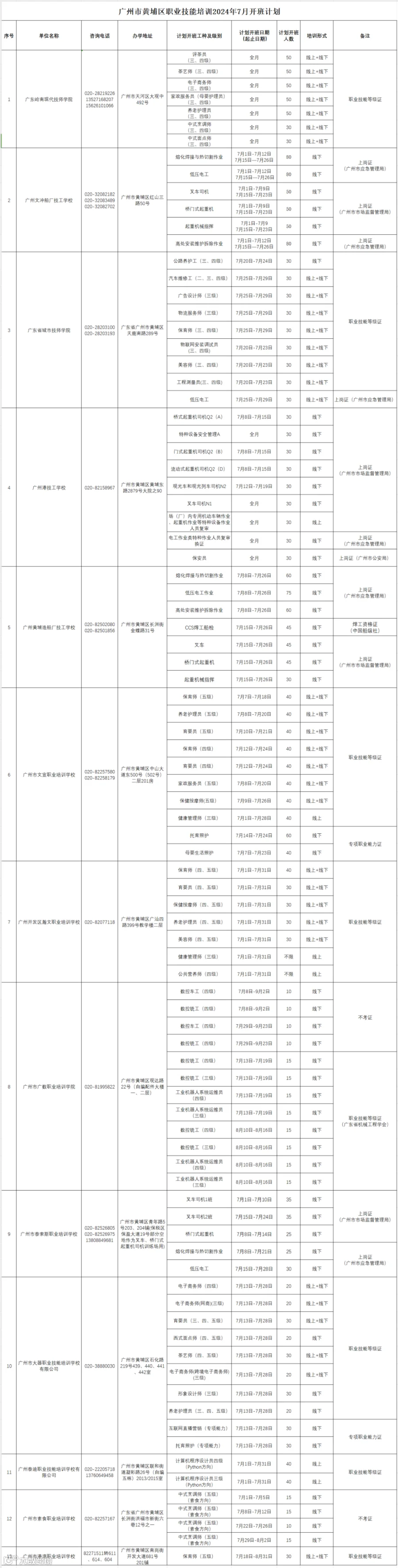 广州市黄埔区职业技能培训2024年7月开班计划通知