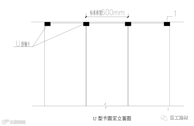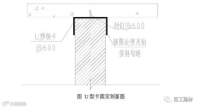 ALC板顶部固定为U型卡固定,缝隙处使用专用勾缝剂处理,U型卡宜设置在两板拼接处,按板宽间距600mm设置,U型卡应事先做除锈处理并刷防锈漆防锈;