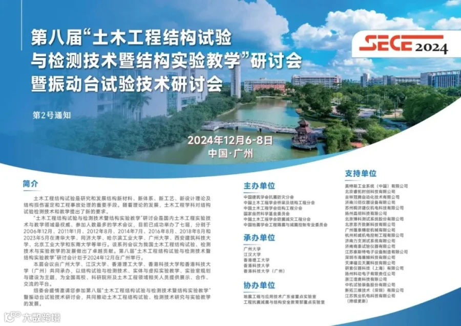 第八届“土木工程结构试验与检测技术暨结构实验教学”研讨会已于2024年12月6日至8日在广州白云国际会议中心举行。本届会议以结构试验与检测技术、实体与虚拟实验教学、实验室规划与建设为主题,为全国高校、科研院所及土木工程领域相关人员提供展示、合作、交流的平台。