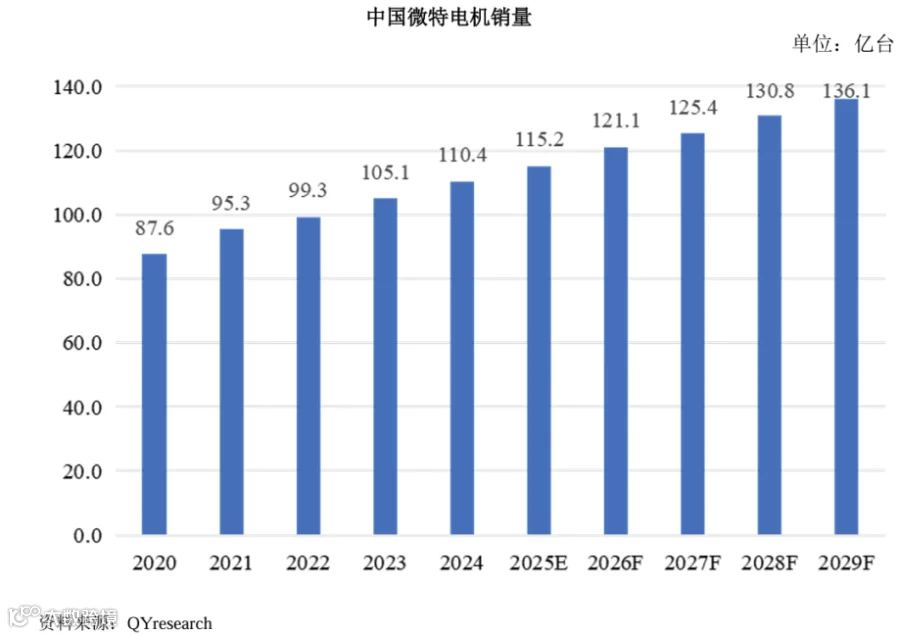 据统计及预测,我国微特电机销量将从2020年的87.6亿台增长至2029年的136.1亿台,期间的年复合增长率达到5.02%。