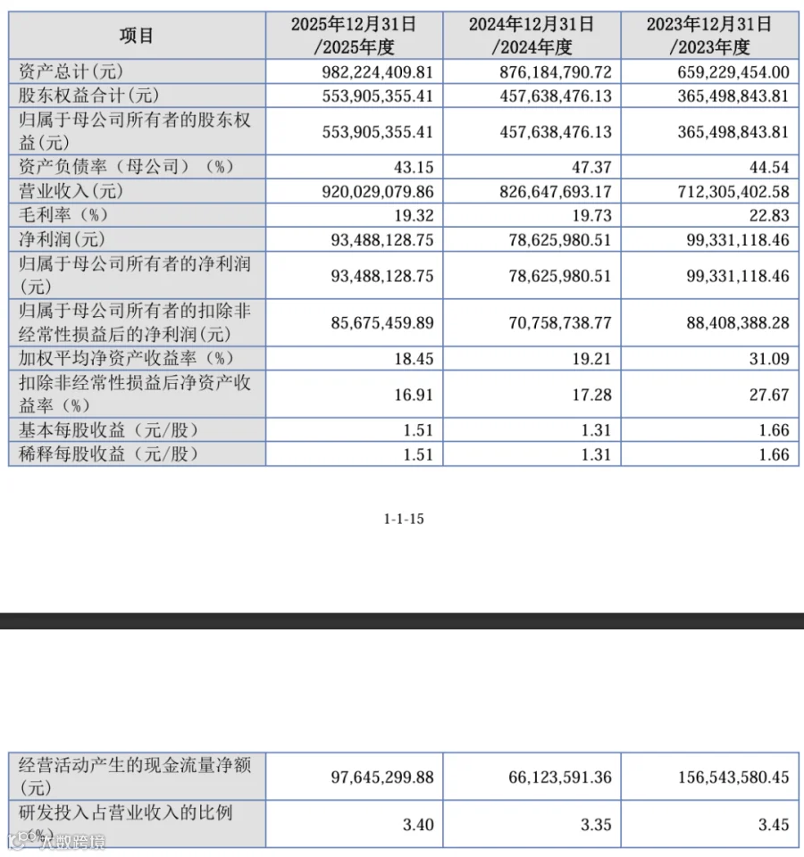 核心盈利指标表现优异,扣非归母净利润从 7075.87 万元增长至 8567.55 万元,主业盈利能力持续增强;2025 年净利润较 2024 年实现显著回升,盈利质量扎实。