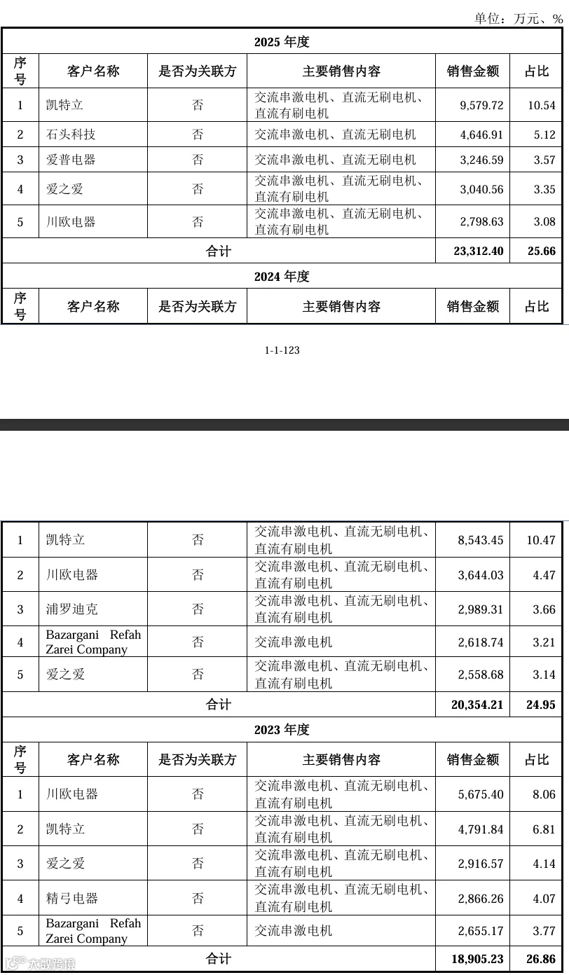 公司与核心客户合作粘性极强,与凯特立的合作持续深化,其常年稳居公司第一大客户,2025 年销售占比达 10.54%,合作覆盖全系列电机产品。