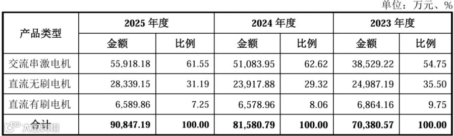 公司核心产品交流串激电机收入持续攀升,2025 年实现收入 5.59 亿元,收入占比长期稳定在 60% 左右,核心主业根基牢固,基本盘优势突出。