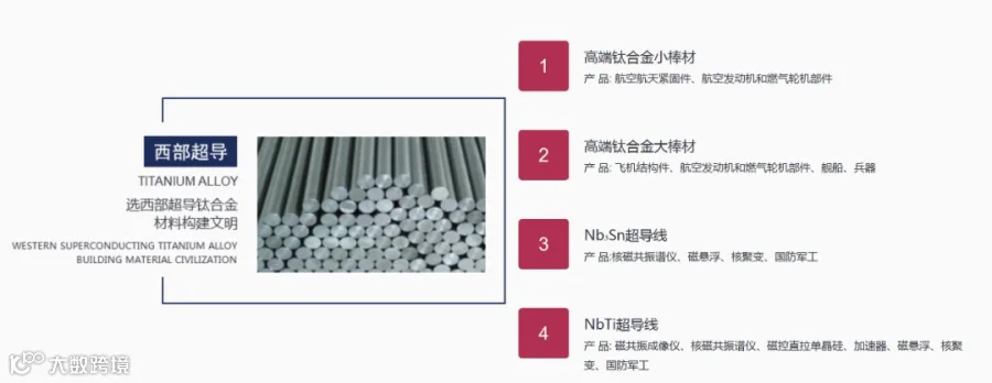 公司主营业务收入主要由高端钛合金材料、超导产品及高性能高温合金材料等的销售收入构成。 高端钛合金材料,包括棒材、丝材和锻坯等;超导产品,包括铌钛锭棒、铌钛超导线材、铌三锡超导线材和超导磁体等;高性能高温 合金材料,包括变形高温合金、铸造和粉末高温合金母合金等。产品以“国际先进、国内空白、 解决急需”为定位,服务国家战略,补上了我国新型战机、舰船制造急需关键材料的“短板”。