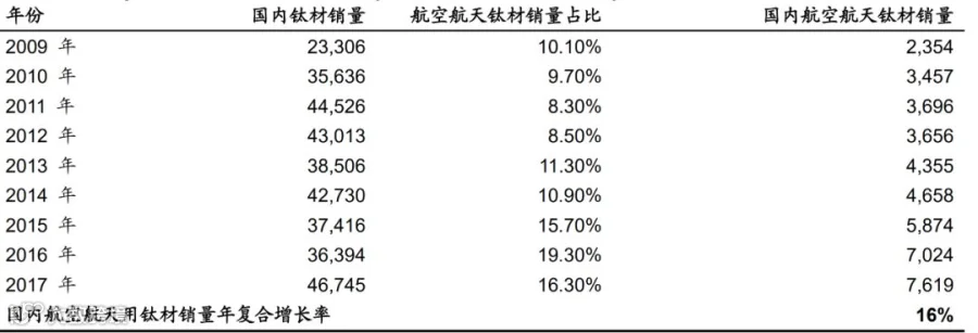 钛合金是飞机和发动机的主要结构材料之一,主要用于飞机的起落架部件、机身的梁、框和紧固件等,发动机风扇、压气机、叶片、鼓筒、机匣、轴等,以及直升机桨毂、连接件。航空领域市场需求不断增加,最近 10年复合增长率达 16%。随着国内军用和民用航空业的发展、 探月太空工程的开展,预计未来 10年航空航天钛材的需求将继续保持高速增长。