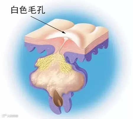 毛孔成因:毛孔前端被油脂及角质阻塞,令粉刺及皮脂无法排出,在肌肤表面形成白色突起。