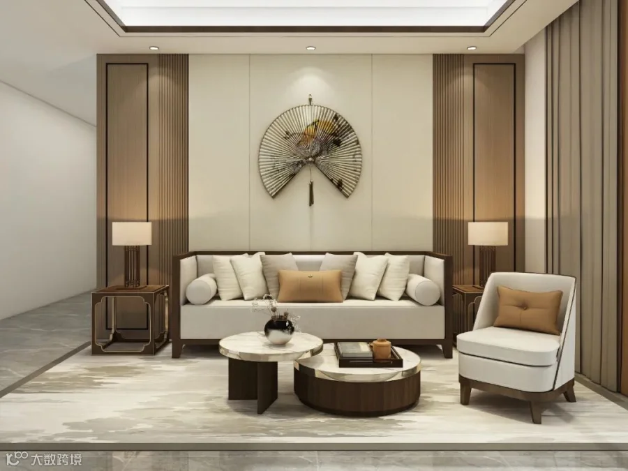 客厅质朴大气,东方元素和高档材质结合,质朴的花色、精致的纹理,营造出新中式风情,添加二三盆栽点缀,布局中正大气、简洁隽永,整个空间清雅含蓄、大气凝远。