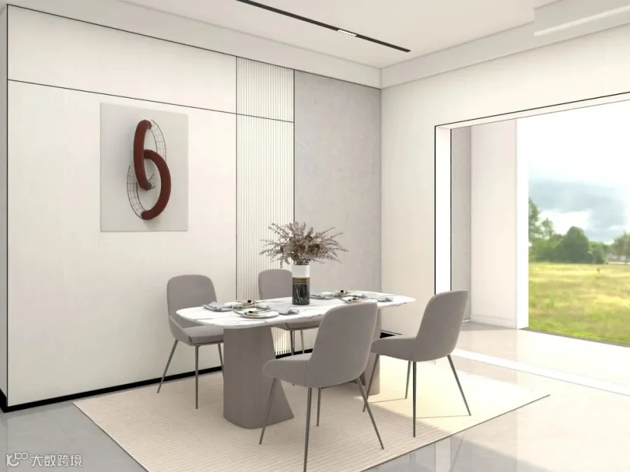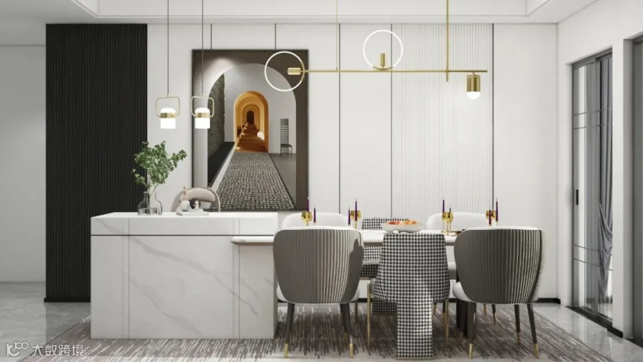 白色系用餐空间总是给人纯净明朗的感觉,融入金色装饰的搭配,更显轻奢气息。