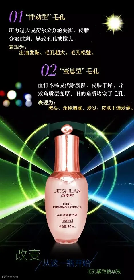 告别毛孔粗大,摆脱面子问题,女人细一些更好看。杰诗蓝毛孔紧致精华液,助你华丽转身,迈向成功!