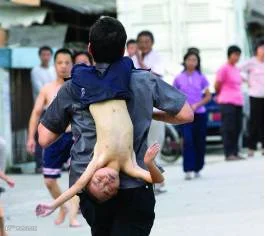 这张图是2012年《南方都市报》的一则图文报道的配图:5月25日下午,治安队员叶锡坤和村民叶德新、叶旭辉在北丫村前河涌救出两名溺水没有呼吸的幼儿,并用水乡片区特有的“倒背孩子跑步”的急救办法,救醒两名幼儿。