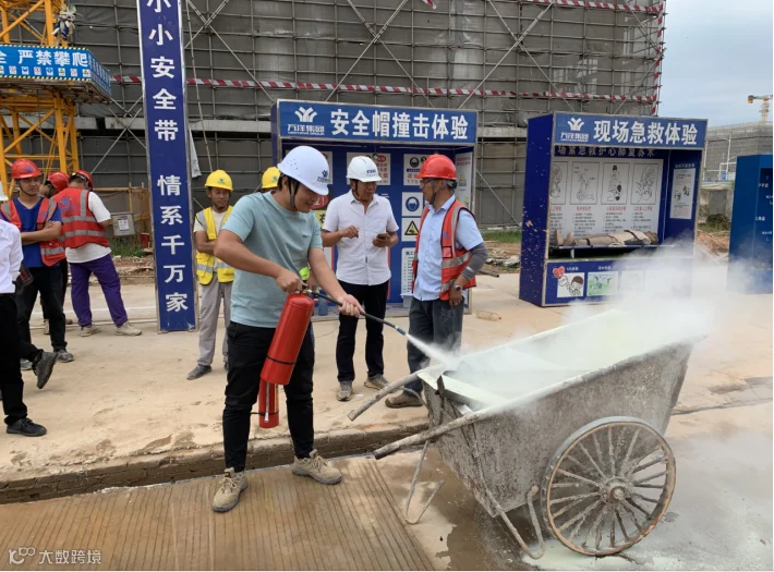 在模拟火灾过程中万洋建设集团现场管理人员更是详细地展示灭火步骤,对于火势情形不同使用的灭火工具作出了详细介绍,并让参与活动的人员在此次演练中练习了消防器具使用。