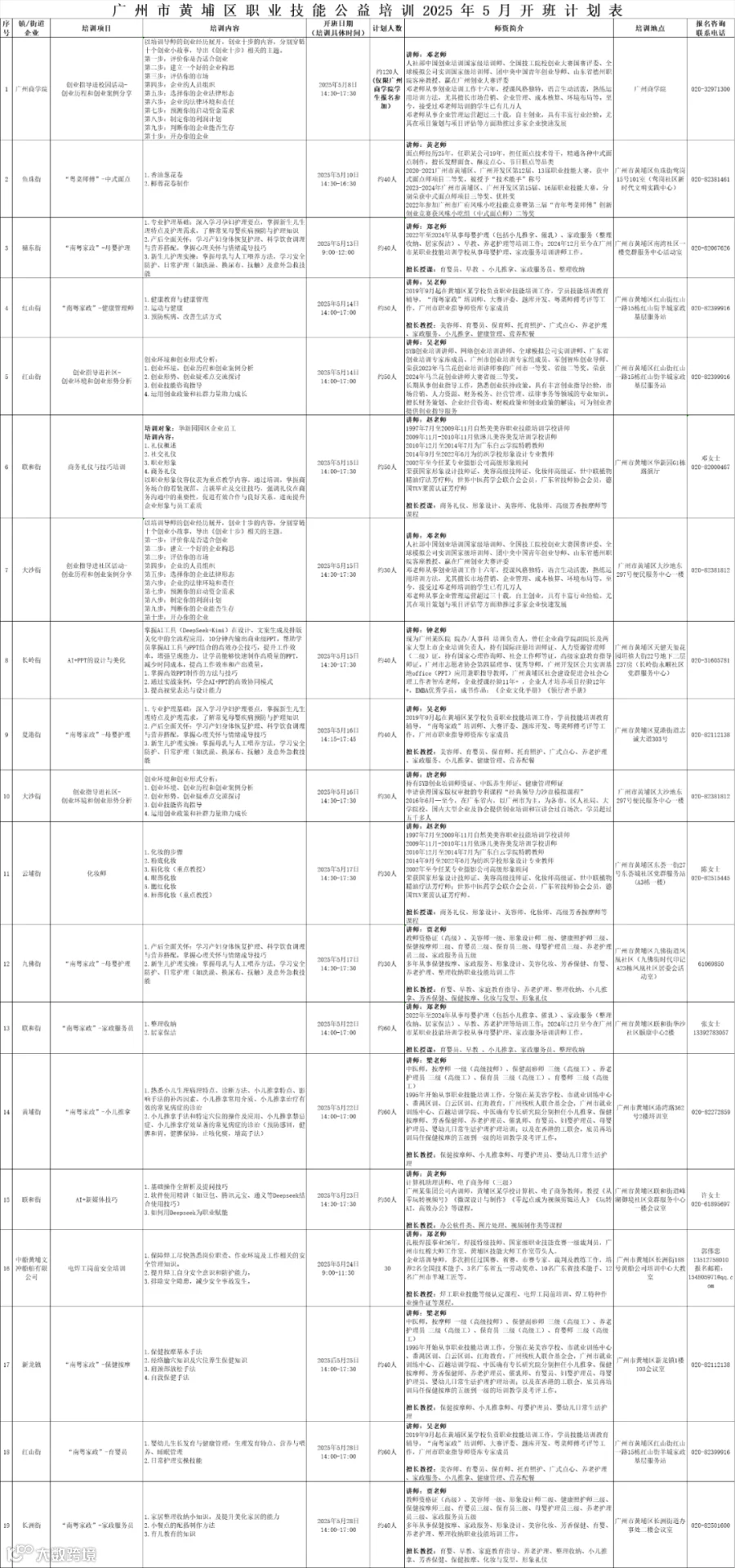 市黄埔区职业技能公益培训2025年5月开班计划表如下,