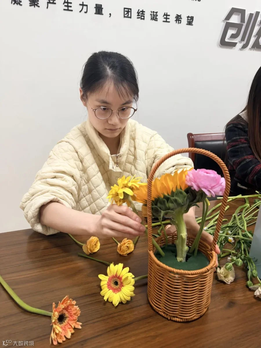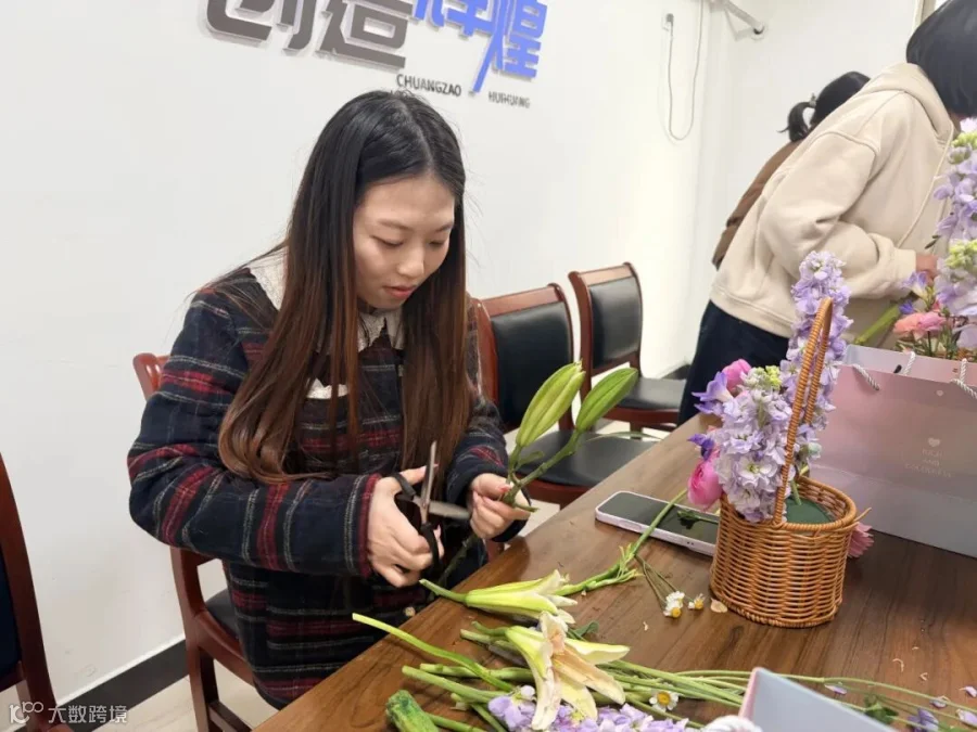 大家充分发挥想象力和创造力,手持花材,修剪、搭配、摆放,一步步将原本零散的花材,打造成一件件独具匠心、错落有致的花艺作品。