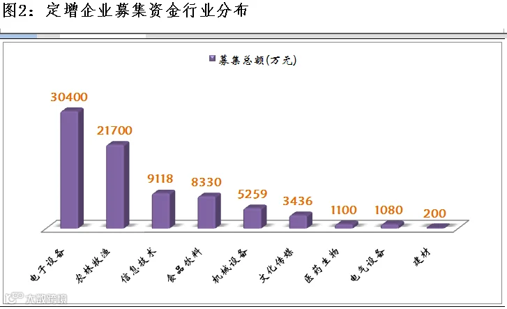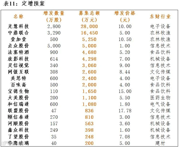 点评:3月28日,共有19家公司公布定增预案,总增发股数16559股,共募集资金8.06亿元。募集资金超过1亿元的有2家,募集资金最大为光慧科技,募集资金28000万元,总体来看,募集金额流向电子设备、农林牧渔行业较多。