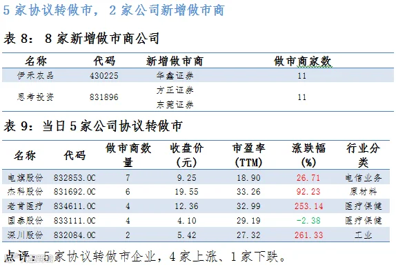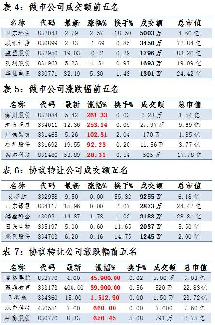 做市企业中有656只个股参与交易,成交额4.39亿元。其中271只个股上涨;6家做市企业成交额破千万,其中卫东环保、联讯证券和益盟股份位列前三位,分别成交5003万元、3450万元和1796万元。