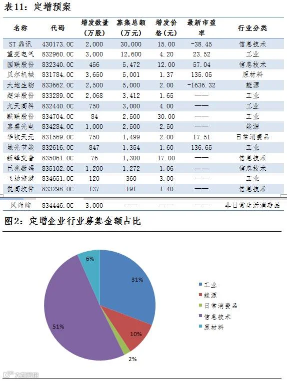 点评:1月15日,共有16家公司公布定增预案,总增发股数2.16亿股,共募集资金7.55亿元,2家公司募集资金超过1亿元,募集资金最大为ST鼎讯,募集资金3亿元,总体来看,募集金额主要流向信息技术行业,占比51%。