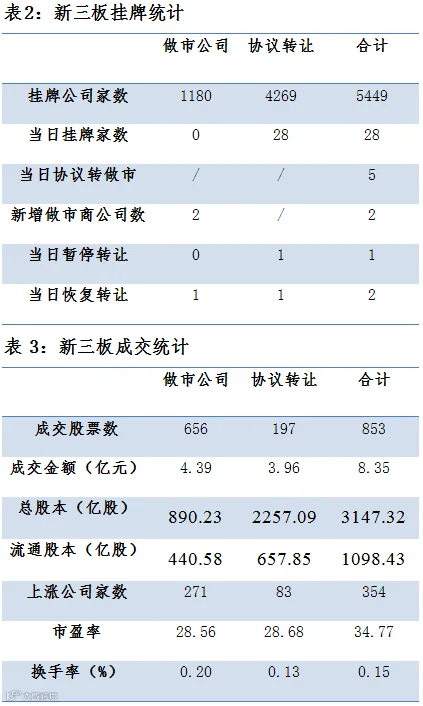 昨日三板有853只股票成交,总成交额继续回落至8.35亿元。其中做市成交4.39亿;协议成交3.96亿元。