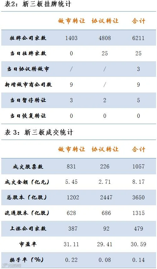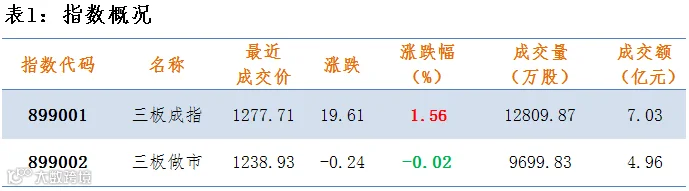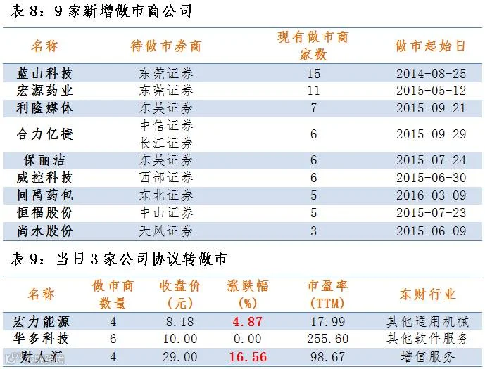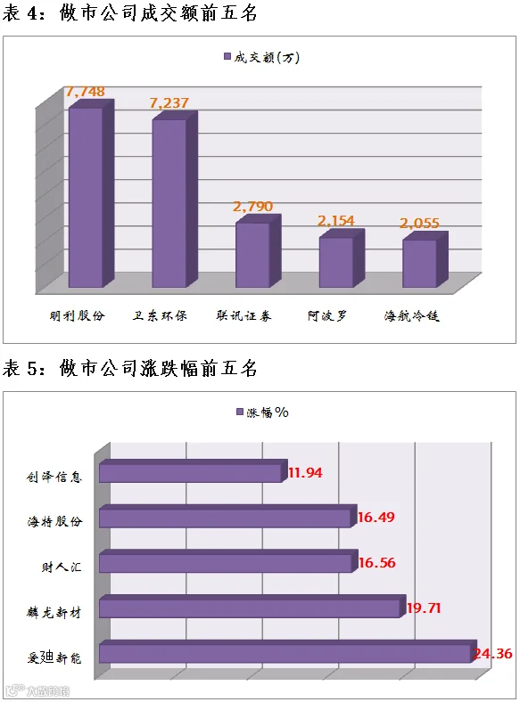 做市企业中有831只个股参与交易,成交额5.45亿元。其中387只个股上涨;7家做市企业成交额破千万,成交额前三名为:明利股份7747万、卫东环保7237万、联讯证券2790万。