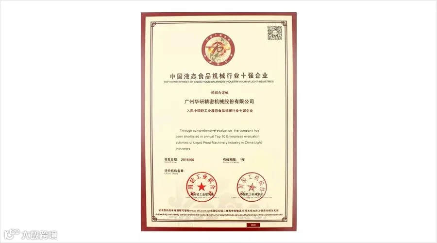 日前,由中国轻工业联合会、中国轻工机械协会组织开展的中国液态食品机械行业十强企业评价结果公布。广州华研精密机械股份有限公司(以下简称“华研”)经综合评价再次成功入围液态食品机械行业十强,这是自2012年以来,华研第四次荣获此殊荣。这是中国轻工业对华研的认可,更是长期以来客户对华研的大力支持,亦是华研实力的体现。